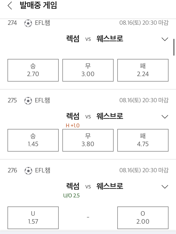 렉섬은 지난 주말 세인트 메리 스타디움에서 2-1로 패하며 2부 리그 생활을 시작했습니다 니다. 웨스트 브롬은 블랙번과의 개막전에서 승리할 수 있는 행운을 누렸지만, 지난 시즌 원정 23경기 중 4경기만 승리하며 개막전 승리를 따내기 어려울 수도 있습니다. 렉섬의 조직력 보다는 웨스트브롬의 공격력과 중원에서의 우위의 전력이 좋다고 보여집니다