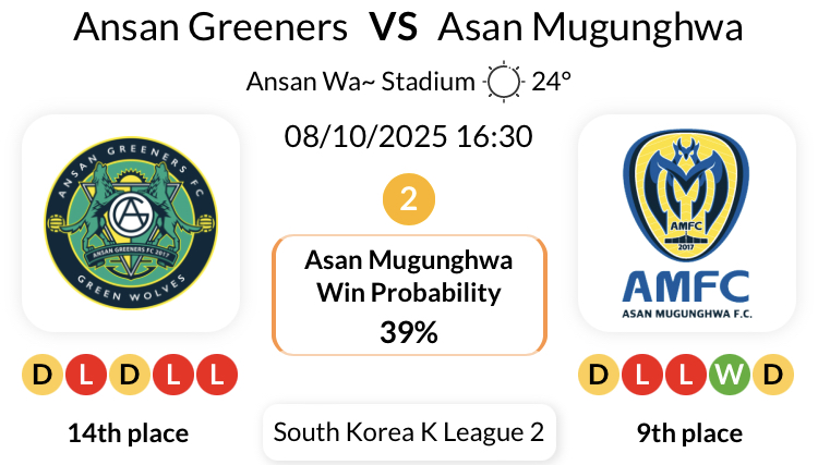 아산 무궁화는 K리그2 안산 그리너스와의 지난 4번의 원정 경기에서 2.5골 이하의 득점을 기록했습니다