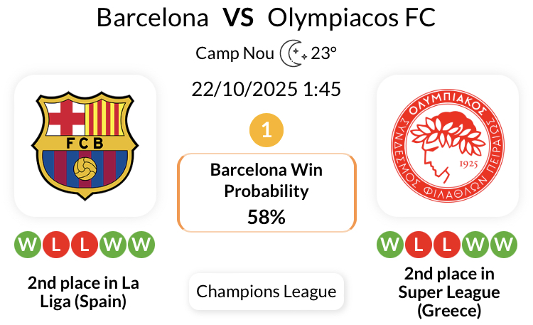 바르셀로나가 올림피아코스 FC와의 두 번의 맞대결에서 1무를 기록한 것을 바탕으로 약간의 통계적 우위를 점하고 있는 가운데, 홈에서 중요한 승리를 거둘 유력한 후보로 이번 경기에 출전합니다.