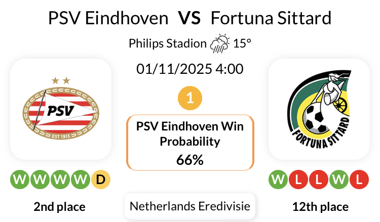 PSV 아인트호벤은 지난 8번의 홈 경기에서 포르투나 시타르를 앞질렀습니다 (에레디비시)