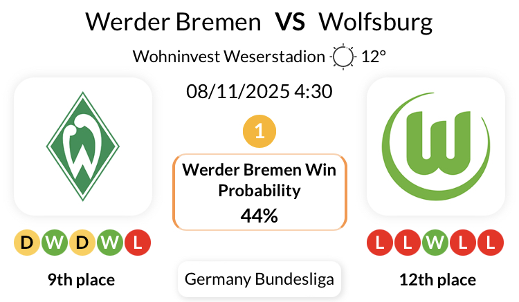 베르더 브레멘은 분데스리가에서 열린 볼프스부르크와의 지난 11경기에서 1골 이상을 허용했습니다