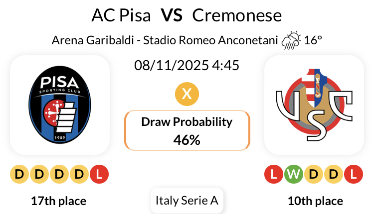 AC 피사의 가장 최근 경기는 하프타임/풀타임에 세리에 A에서 3경기 연속 홈 무승부를 기록한 경기입니다