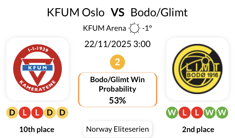 가장 최근 20경기 중 17경기(엘리트세리엔)에서 KFUM 오슬로는 패배가 없습니다