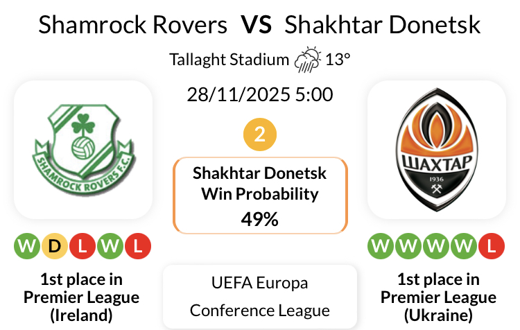 샴록 로버스는 최근 6경기와 홈 6경기에서 50%의 패배율을 기록했으며, 샤흐타르 도네츠크는 모든 리그에서 최근 6경기에서 5승을 기록했습니다.