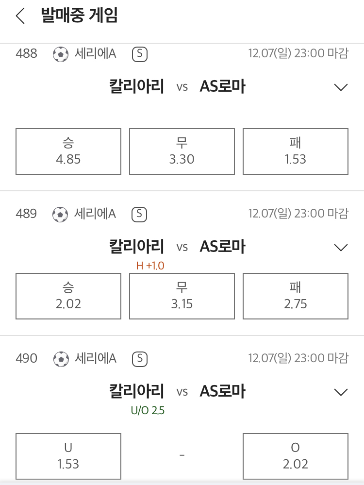칼리아리 5.60 / 무 3.70 / 로마 1.65