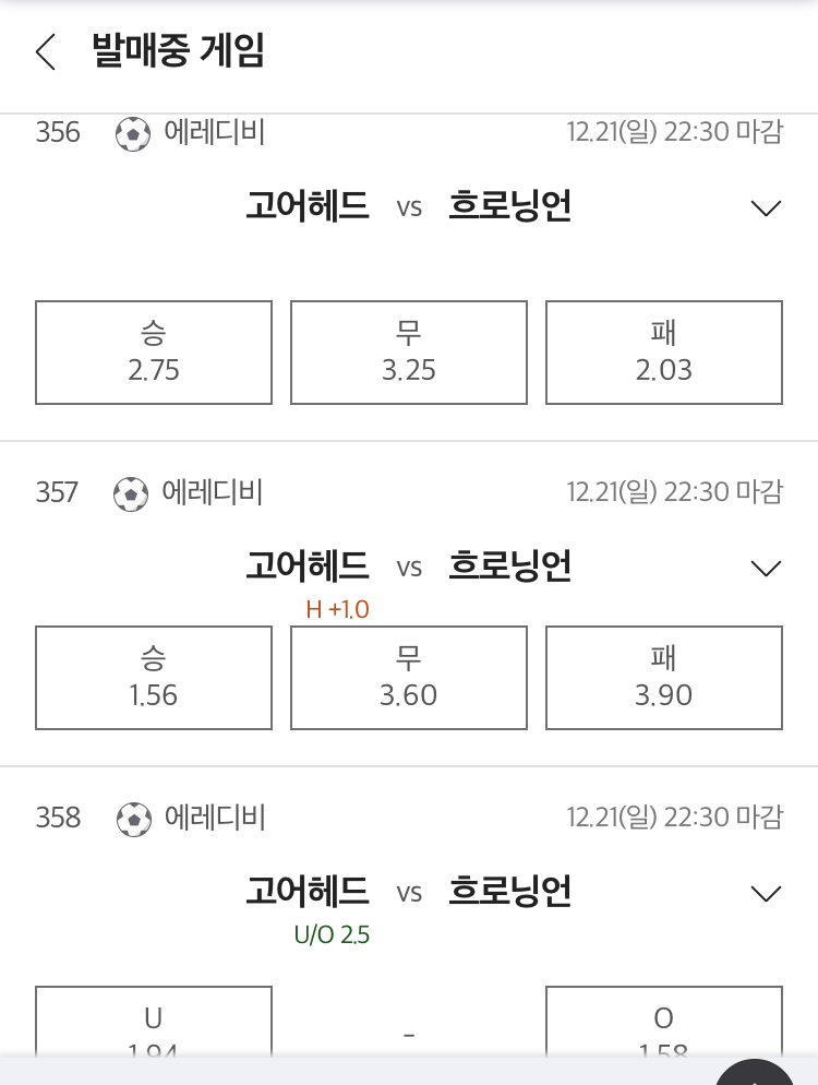 일반 승에서는 흐로닝언 쪽 배당이 더 낮게 형성되어 있지만, 핸디캡 +1.0에서 고어헤드 승 배당이 1.56으로 매우 낮습니다. 이는 흐로닝언이 승리하더라도 대승 가능성은 낮다는 시장 평가입니다.