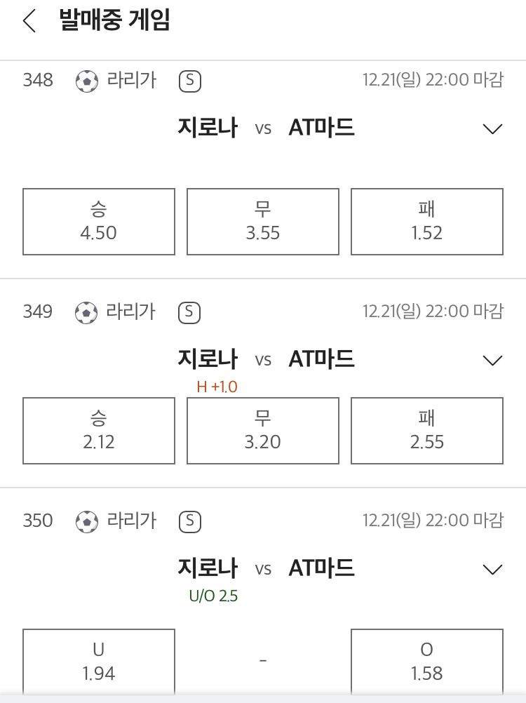 일반 승 배당에서 AT 마드리드 패(승)가 1.52로 강하게 눌려 있으며, 이는 시장에서 AT 마드리드의 안정 승을 기본값으로 보고 있음을 의미합니다. 다만 핸디캡 +1.0에서 지로나 승 배당이 2.12로 형성된 점은 AT 마드리드의 대승 가능성은 제한적이라는 해석이 가능합니다.