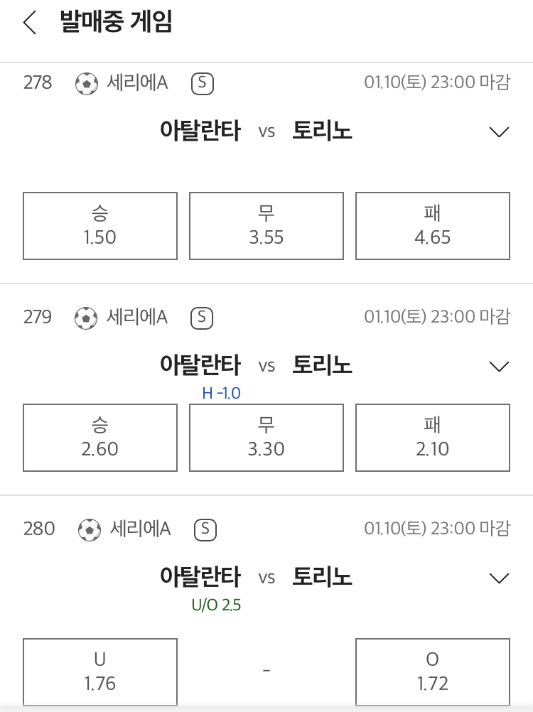배당은 아탈란타 승 쪽으로 안정적으로 형성되어 있으며, -1.0 핸디캡에서는 한 골 차 승부 가능성을 반영합니다. 언더오버 2.5는 균형 상태지만, 아탈란타의 홈 득점력을 고려하면 오버 가능성도 충분합니다.