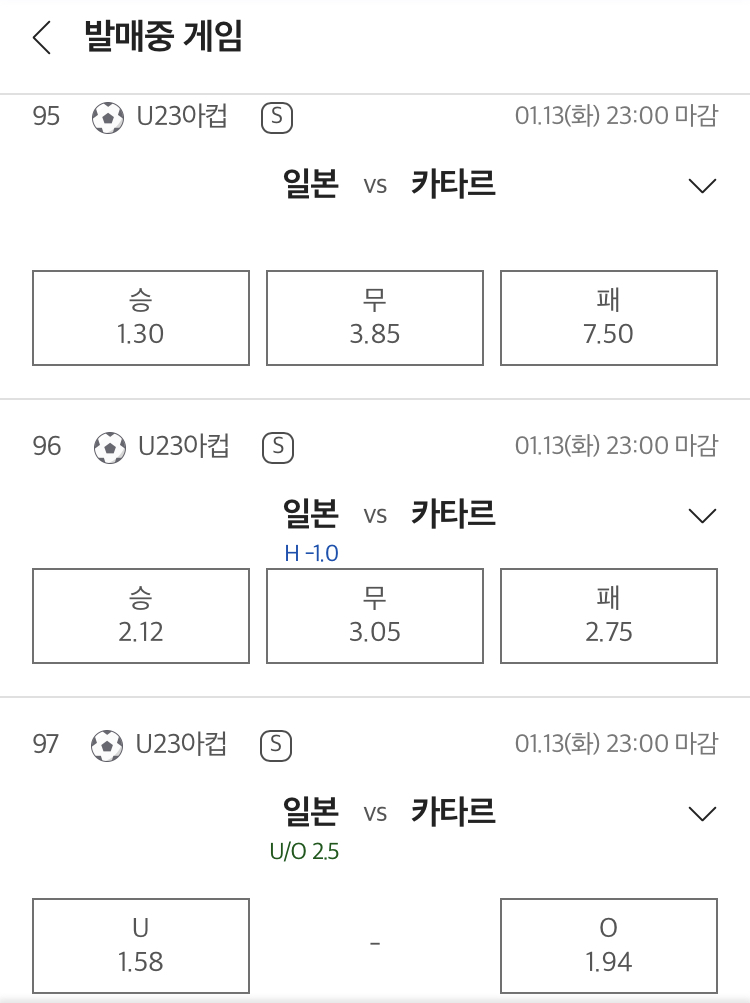 일반 승 배당이 1.30까지 낮게 형성된 점은 일본의 확실한 우위를 반영합니다. 다만 핸디캡 -1.0에서 배당이 비교적 높게 유지되고 있어, 대승보다는 안정적인 1~2골 차 승리 쪽으로 시장이 보고 있음을 알 수 있습니다.