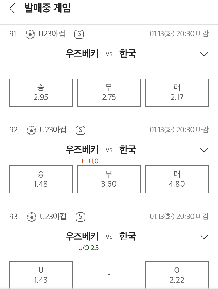 배당은 한국 승이 2.17로 형성되어 있으나, 이는 절대적인 우위라기보다는 근소한 전력 상위 평가에 가깝습니다. 오히려 핸디캡 +1.0에서 우즈베키스탄 쪽 배당이 낮게 형성된 점은, 접전 또는 한 골 차 승부 가능성을 강하게 시사합니다.