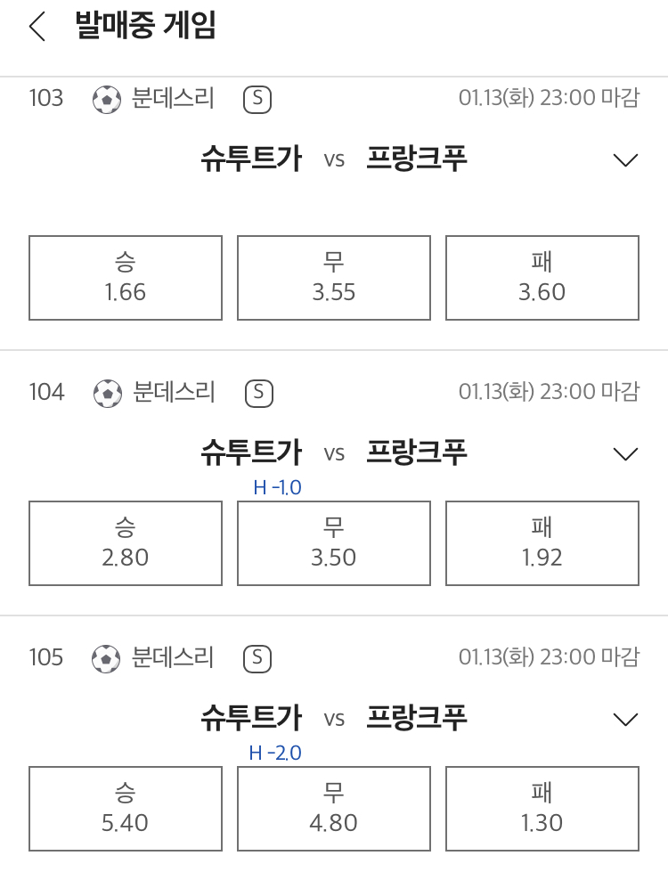 일반 승 배당이 1.66까지 형성된 것은 슈투트가르트의 홈 우위를 명확히 반영합니다. 핸디캡 -1.0에서는 다소 애매한 배당 분포를 보이는데, 이는 한 골 차 승부 가능성을 열어두는 시장 평가로 해석됩니다.