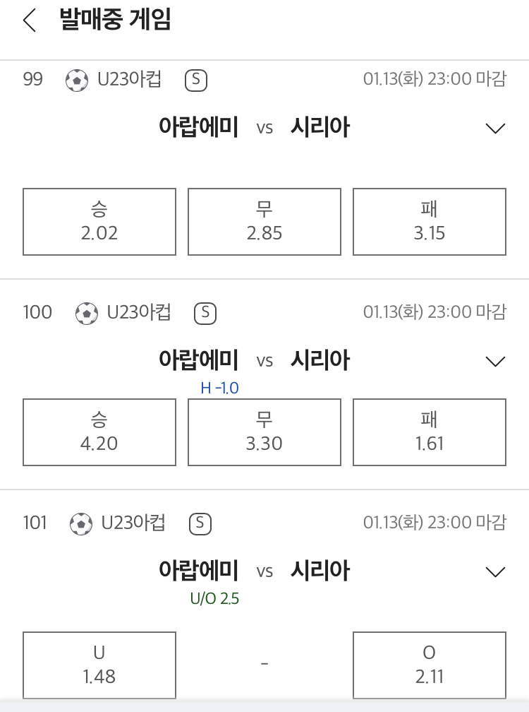 배당 흐름을 보면 일반승은 UAE가 근소 우위로 평가받고 있으나, 핸디캡 -1.0에서 시리아 쪽 배당이 낮게 형성되어 있어 UAE의 다득점 승리 가능성은 낮게 평가되고 있습니다.