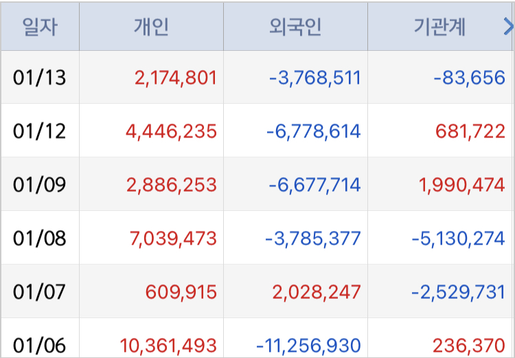 최근 거래 동향을 보면 외국인과 기관, 개인 투자자 간 매매 흐름이 다음과 같습니다.