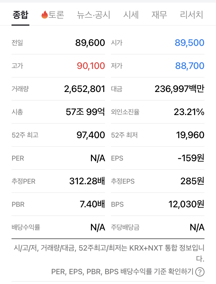 단기 목표는 ₩100,000, 지지선은 ₩85,000 전후로 보는 것이 합리적입니다.