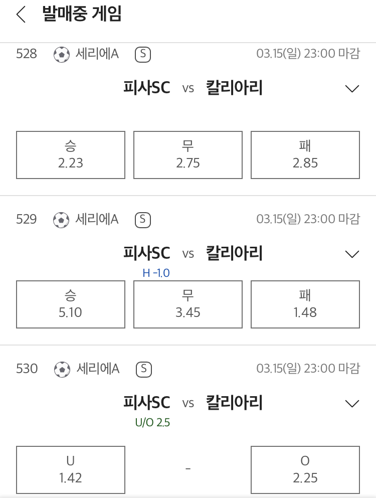 핸디캡 예상 (-1 피사) : 칼리아리