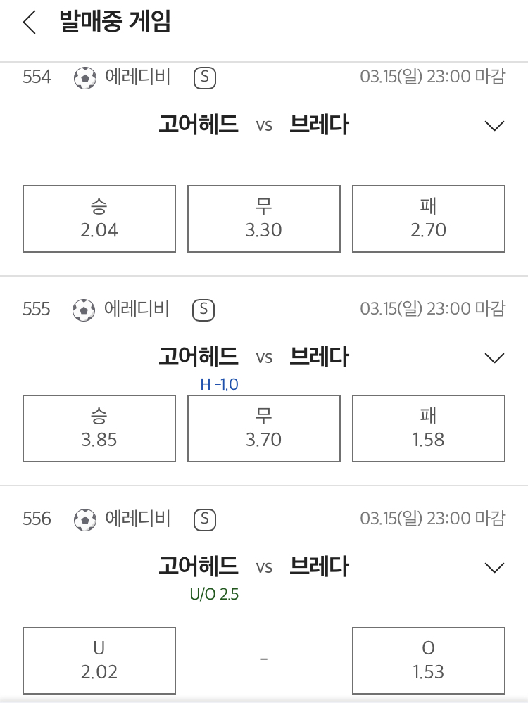 해외 배당 흐름을 보면 일반 승무패 배당은 고어헤드가 근소하게 우세하지만 큰 차이는 없어 접전 경기로 평가되는 분위기입니다. 핸디캡 -1에서는 브레다 쪽 배당이 낮게 형성되어 고어헤드가 큰 점수차로 승리할 가능성은 높게 보지 않는 시장 흐름이 나타납니다. 반면 언더오버 2.5에서는 오버 배당이 크게 낮게 형성되어 에레디비지에 특유의 다득점 경기 가능성을 강하게 반영하고 있습니다.