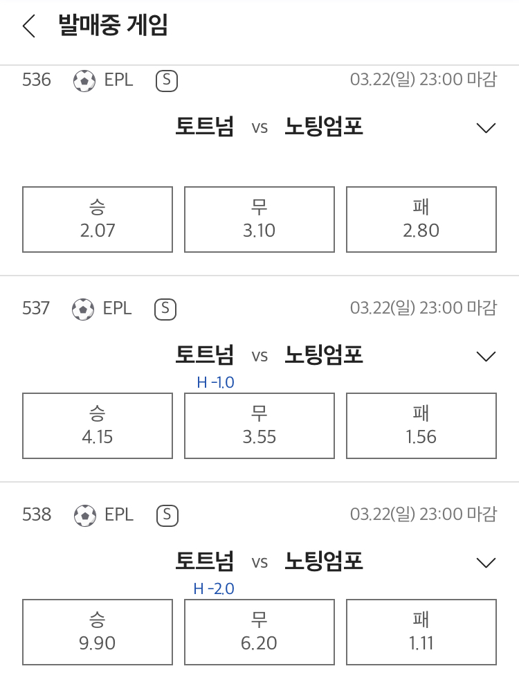 승무패는 토트넘 승, 핸디캡은 노팅엄 포레스트 +1.0, 언더오버는 기준선 부근에서 오버 쪽이 근소 우세입니다.