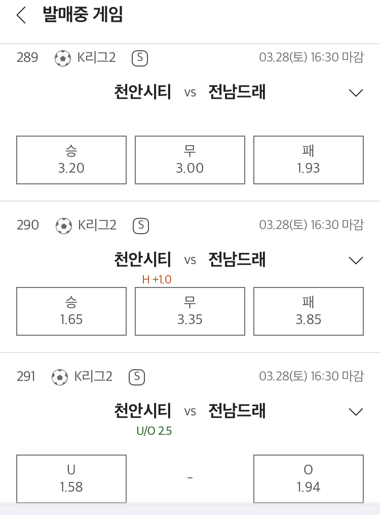 승무패는 전남 승, 핸디캡은 천안 플핸승, 언더오버는 언더가 유력합니다.