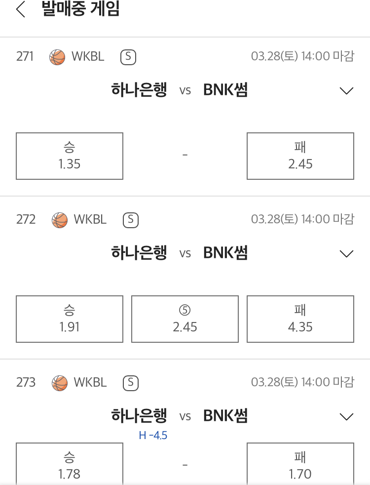 승무패는 하나원큐 승, 핸디캡은 BNK 썸 플핸승, 언더가 유력합니다.
