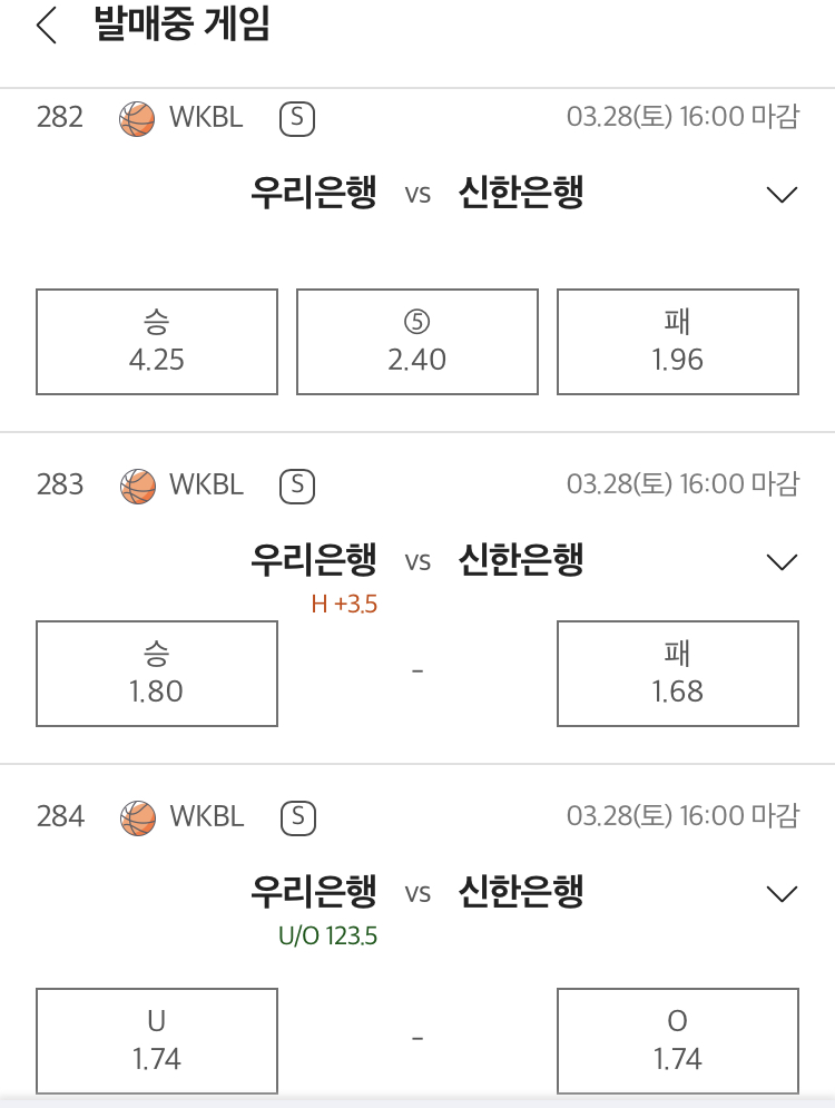 승무패는 신한은행 승, 핸디캡은 우리은행 플핸승이 안정적이며 언더가 유력합니다.