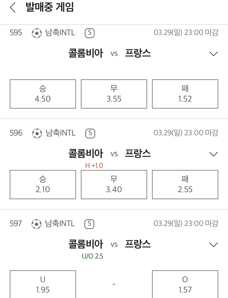 승무패는 프랑스 승, 핸디캡 +1 기준 콜롬비아 무 가능성, 언더오버는 오버 2.5가 우세합니다.