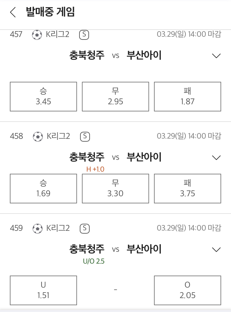 승무패는 부산 승, 핸디캡은 충북청주 +1 기준 무 접근, 언더오버는 언더 2.5가 유력합니다.