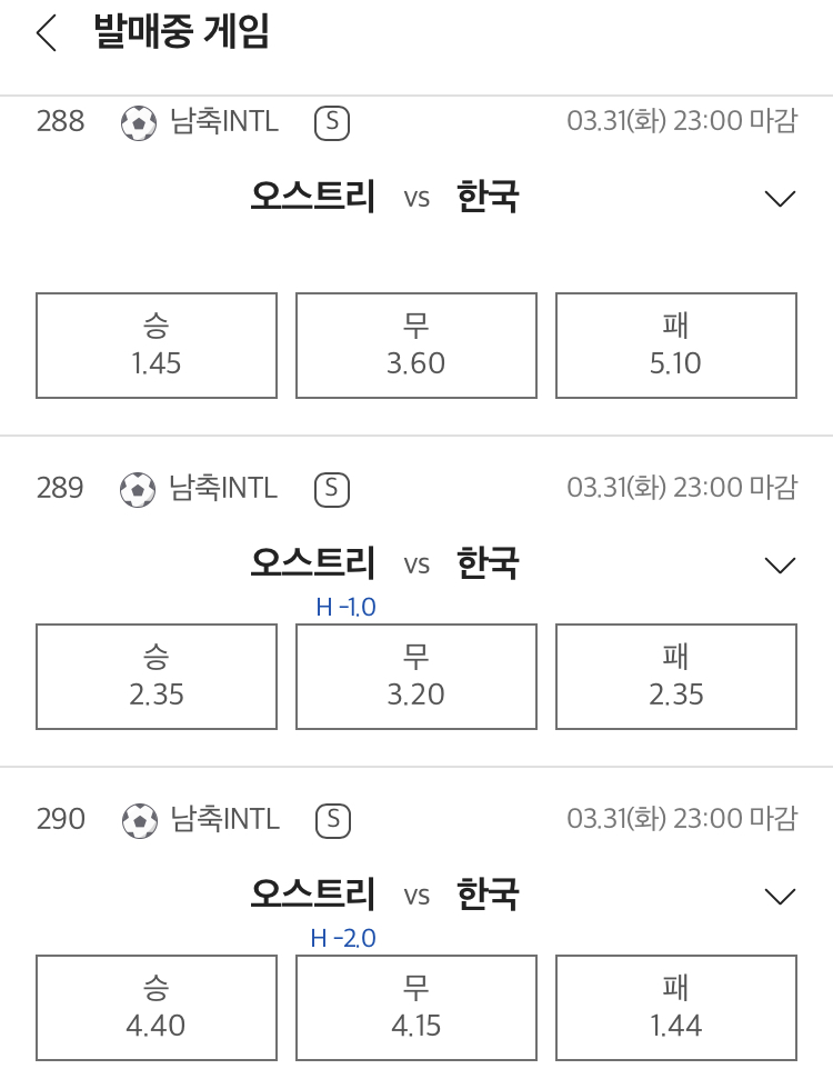 승무패 오스트리아 승, 핸디캡은 한국 플러스, 오버가 유력합니다.