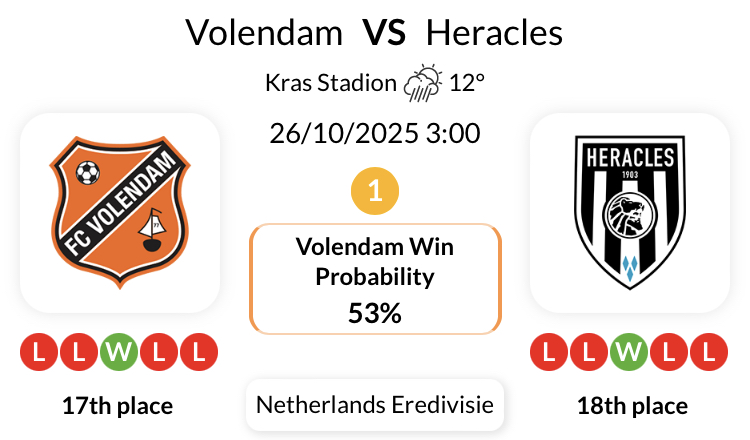 볼렌담은 홈 경기에서 평균 1.50골을 실점하고 있습니다 (에레디비시)
