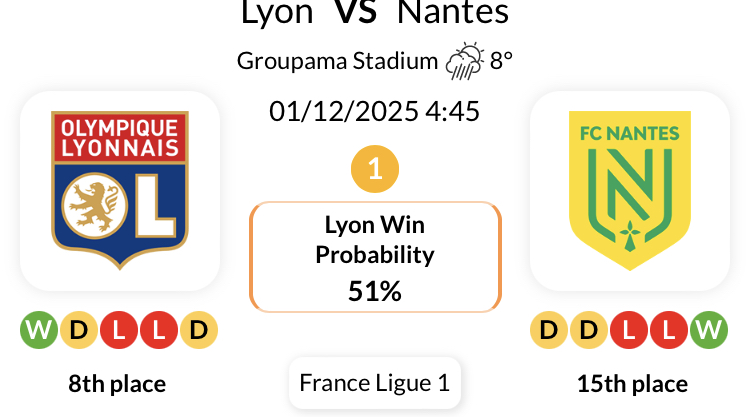 리옹은 리그 1에서 낭트를 상대로 한 지난 24경기 중 22경기에서 무패 행진을 이어가고 있습니다